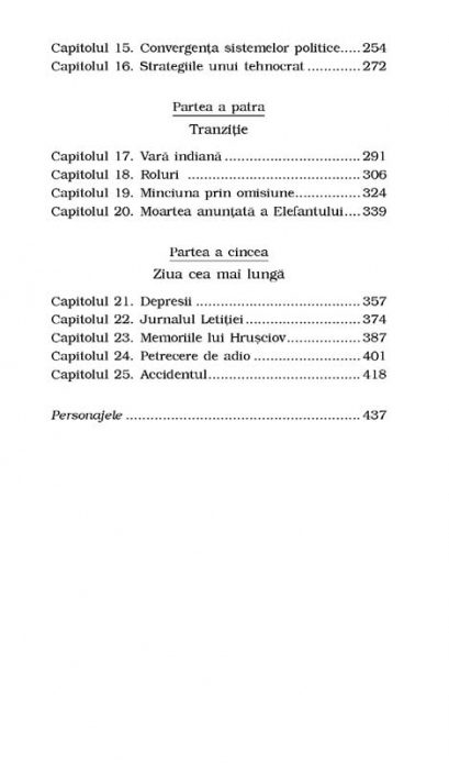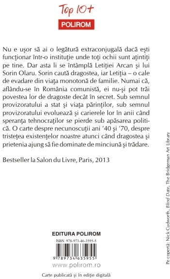 Editia a III-a Bestseller la Salon du Livre, Paris, 2013 Nu e usor sa ai o legatura extraconjugala daca esti functionar intr-o institutie unde toti ochii sint atintiti pe tine. Dar asta li se intimpla Letitiei Arcan si lui Sorin Olaru. Sorin cauta dragostea, iar Letitia – o cale de evadare din viata monotona de familie. Numai ca, aflindu-se in Romania comunista, ei nu-si pot trai povestea lor de dragoste decit in secret. Sub semnul provizoratului a stat si viata parintilor, sub semnul provizoratului evolueaza si carierele lor in anii cind speranta tehnocratilor se pierde sub apasarea politica. O carte despre necunoscutii ani ’40 si ’70, despre tristetea existentelor noastre atunci cind dragostea si prietenia ajung sa fie dominate de minciuna si tradare.