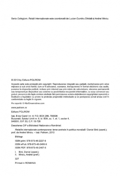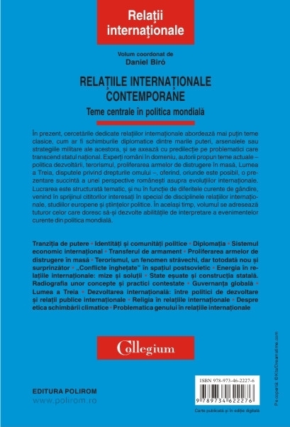 Prefata de Andrei Miroiu In prezent, cercetarile dedicate relatiilor internationale abordeaza mai putin teme clasice, cum ar fi schimburile diplomatice dintre marile puteri, arsenalele sau strategiile militare ale acestora, si se axeaza cu predilectie pe problematici care transcend statul national. Experti romani in domeniu, autorii propun teme actuale – politica dezvoltarii, terorismul, proliferarea armelor de distrugere in masa, Lumea a Treia, disputele privind drepturile omului –, oferind, oriunde este posibil, o prezentare succinta a unei perspective romanesti asupra evolutiilor internationale. Lucrarea este structurata tematic, si nu in functie de diferitele curente de gindire, venind in sprijinul cititorilor interesati in special de disciplinele relatiilor internationale, studiilor europene si stiintelor politice. In acelasi timp, volumul se adreseaza tuturor celor care doresc sa-si dezvolte abilitatile de interpretare a evenimentelor curente din politica mondiala.