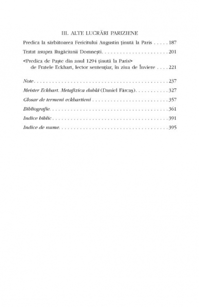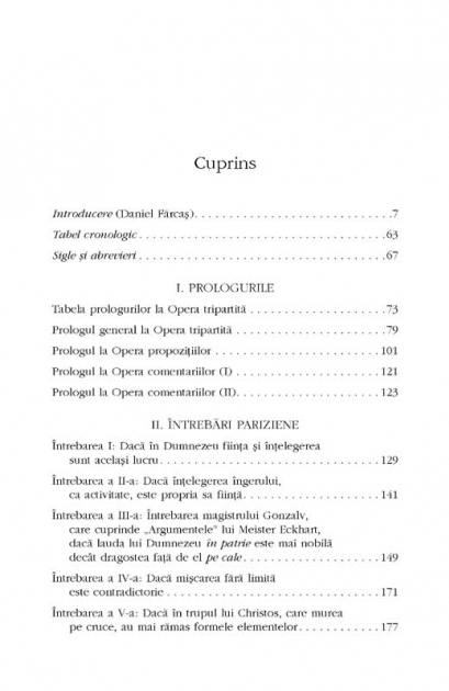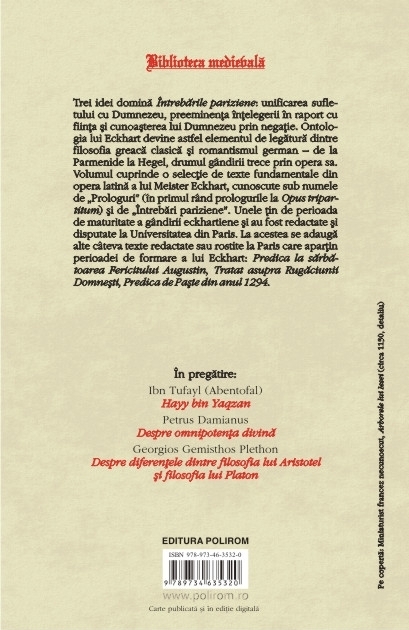 Editie bilingva Traducere din limba latina, introducere, indici, glosar si note explicative de Daniel Farcas Trei idei domina Intrebarile pariziene: unificarea sufletului cu Dumnezeu, preeminenta intelegerii in raport cu fiinta si cunoasterea lui Dumnezeu prin negatie. Ontologia lui Eckhart devine astfel elementul de legatura dintre filosofia greaca clasica si romantismul german – de la Parmenide la Hegel, drumul gindirii trece prin opera sa. Volumul cuprinde o selectie de texte fundamentale din opera latina a lui Meister Eckhart, cunoscute sub numele de „Prologuri” (in primul rind prologurile la Opus tripartitum) si de „Intrebari pariziene”. Unele tin de perioada de maturitate a gindirii eckhartiene si au fost redactate si disputate la Universitatea din Paris. La acestea se adauga alte citeva texte redactate sau rostite la Paris care apartin perioadei de formare a lui Eckhart: Predica la sarbatoarea Fericitului Augustin, Tratat asupra Rugaciunii Domnesti, Predica de Paste din anul 1294.