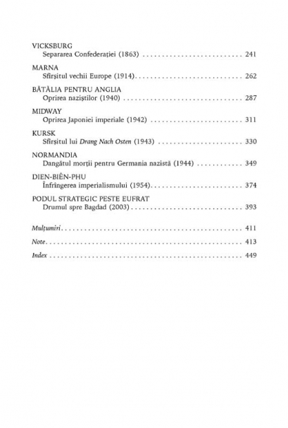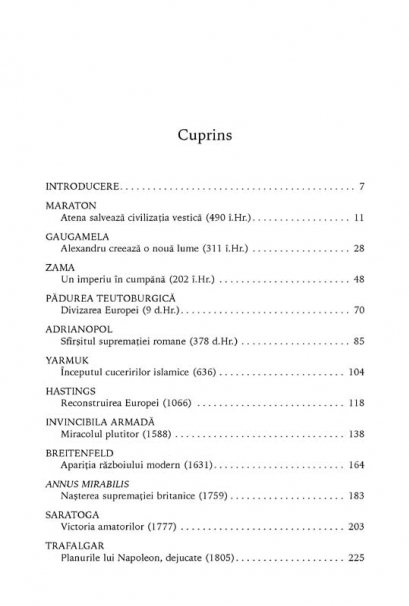 Traducere de Andra Hancu si Radu Andriescu Unele razboaie inseamna doar cimpuri de lupta si victime din ambele tabere. Altele insa ajung sa schimbe harta lumii. Volumul propune o analiza a ultimilor 2.500 de ani prin intermediul a douazeci de confruntari armate care au influentat decisiv cursul istoriei. De la Maraton, unde grecii au respins in repetate rinduri fortele mult mai numeroase ale armatei persane, si pina la invadarea Irakului de catre fortele aliate, autorii ne arata cum se elaboreaza strategiile militare si cum se iau deciziile pe cimpul de lupta. Toate conflictele sint prezentate in contextul lor, cu armatele si liderii participanti, cu momentele-cheie si deciziile ce au condus la deznodamintul lor, intr-un tur de orizont care ofera cheia pentru a intelege douazeci de momente cruciale din istoria omenirii. Din cuprins: Maraton • Gaugamela • Zama • Padurea Teutoburgica • Adrianopol • Yarmuk • Hastings • Invincibila Armada • Breitenfeld • Annus mirabilis • Saratoga • Trafalgar • Vicksburg • Marna • Batalia pentru Anglia • Midway • Kursk • Normandia • Dien-Biên-Phu • Podul strategic peste Eufrat
