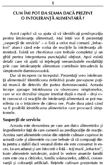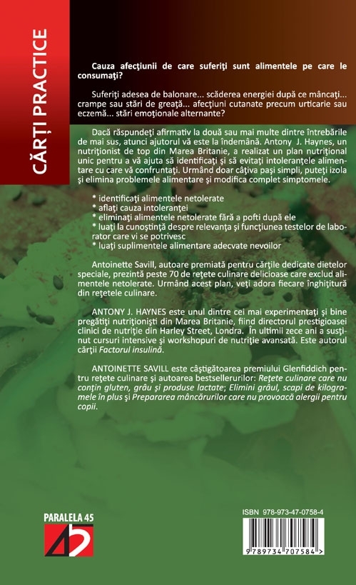 Cauza afecţiunii de care suferiţi sunt alimente pe care le consumaţi? Suferiţi adesea de baonare… scăderea energiei după ce mâncaţi… crampe sau stări de greaţă… afecţiuni cutanate precum urticarie sau eczemă… stări emoţionale alternante? Dacă răspundeţi afirmativ la două sau mai multe întrebările de mai sus, atunci ajutorul vă este la îndemână. Anthony J. Haynes, un nutriţionist de top din Marea Britanie, a realizat un plan nutriţional unic pentru a vă ajuta să identificaţi şi să evitaţi intoleranţele alimentare cu care vă confruntaţi. Urmând doar câţiva paşi simpli, puteţi izola şi elimina problemele alimentare şi modifica complet simptomele.