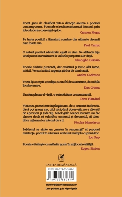 De la gradul zero al scriiturii lirice la ecouri de mit antic si reflexe multimedia, noul volum al Ioanei Ieronim difera de cartile anterioare prin asumarea propriei sentimentalitati. Daca pina acum poeta cauta „adevarurile” lumii, notate, pe cit posibil, fara distorsiuni subiective, in versurile de fata ea foloseste instrumentele expresive – libera de mode si de anxietatea influentei – intr-o aventura a autocunoasterii, o interogare de sine in teritoriul privilegiat al sentimentelor.