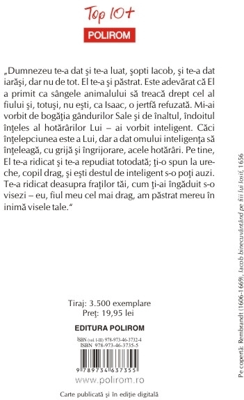 Traducere din limba germana si note de Petru Manoliu „Dumnezeu te-a dat si te-a luat, sopti Iacob, si te-a dat iarasi, dar nu de tot. El te-a si pastrat. Este adevarat ca El a primit ca singele animalului sa treaca drept cel al fiului si, totusi, nu esti, ca Isaac, o jertfa refuzata. Mi-ai vorbit de bogatia gindurilor Sale si de inaltul, indoitul inteles al hotaririlor Lui – ai vorbit inteligent. Caci intelepciunea este a Lui, dar a dat omului inteligenta sa inteleaga, cu grija si ingrijorare, acele hotariri. Pe tine, El te-a ridicat si te-a repudiat totodata; ti-o spun la ureche, copil drag, si esti destul de inteligent s-o poti auzi. Te-a ridicat deasupra fratilor tai, cum ti-ai ingaduit s-o visezi – eu, fiul meu cel mai drag, am pastrat mereu in inima visele tale.”