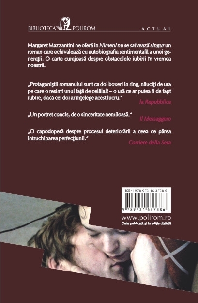 Traducere din limba italiana de Gabriela Lungu Margaret Mazzantini este autoarea bestsellerului Nu te misca (cu peste doua milioane de exemplare vindute), tradus in 35 de limbi si ecranizat in regia lui Sergio Castellitto, cu Penelope Cruz in rolul principal. Margaret Mazzantini ne ofera in Nimeni nu se salveaza singur un roman care echivaleaza cu autobiografia sentimentala a unei generatii. O carte curajoasa despre obstacolele iubirii in vremea noastra. Delia si Gaetano erau cindva un cuplu. Acum trebuie sa invete sa-si uite, fiecare, perechea si deprinderile. Stau amindoi intr-un restaurant, la putin timp dupa ce au distrus ceea ce fusese o familie. Delia si Gaetano sint inca tineri – au treizeci si ceva de ani, o virsta la care poti s-o iei oricind de la capat. Ar vrea sa se impace, insa problemele din trecut, revelate in flashbackuri succesive, ii bintuie. Dar unde au gresit? Problema e ca nici unul nu stie. Pasiunea de la inceput si furia de la sfirsit sint inca la fel de prezente. Crescuti intr-o epoca in care totul pare sa fi fost deja spus, schimba intre ei cuvinte ce nu reusesc sa dea glas singuratatii, dorintelor lor, pentru ca traiesc in confuzia unui soi de analfabetism afectiv. Povestea unui cuplu ca multe altele, un cuplu ca noi, contemporan cu noi. „Protagonistii romanului sint ca doi boxeri in ring, nauciti de ura pe care o resimt unul fata de celalalt – o ura ce ar putea fi de fapt iubire, daca cei doi ar intelege acest lucru.” (la Repubblica) „Un portret concis, de o sinceritate nemiloasa.” (Il Messaggero) „O capodopera despre procesul deteriorarii a ceea ce parea intruchiparea perfectiunii.” (Corriere della Sera)