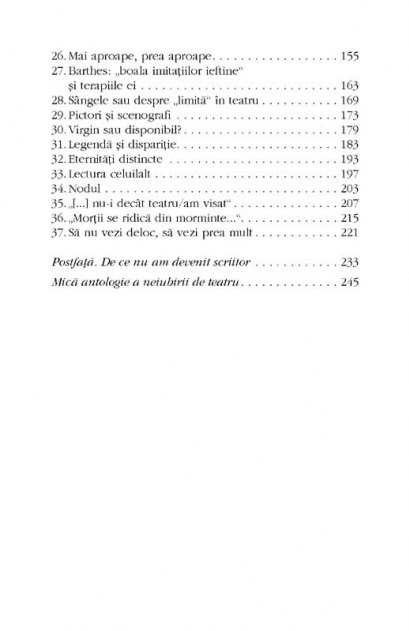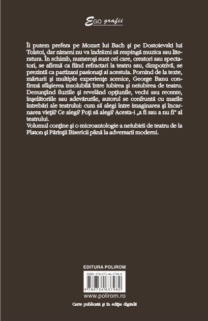 Traducere de Ileana Littera Foto autor: Mihaela Marin Ii putem prefera pe Mozart lui Bach si pe Dostoievski lui Tolstoi, dar nimeni nu va indrazni sa respinga muzica sau literatura. In schimb, numerosi sint cei care, creatori sau spectatori, se afirma ca fiind refractari la teatru sau, dimpotriva, se prezinta ca partizani pasionati ai acestuia. Pornind de la texte, marturii si multiple experiente scenice, George Banu confirma sfisierea insolubila intre iubirea si neiubirea de teatru. Denuntind iluziile si revelind optiunile, vechi sau recente, inselatoriile sau adevarurile, autorul se confrunta cu marile intrebari ale teatrului: cum sa alegi intre imaginarea si incarnarea vietii? Ce alegi? Poti sa alegi? O carte a interogatiilor esentiale, semnata de un autor care s-a luptat zilnic cu increderea si neincrederea in teatru. Destin personal, destin al unei arte. O antologie concentrata de texte istorice ii permite cititorului sa exploreze datele procesului intentat teatrului din Antichitate pina azi.
