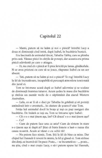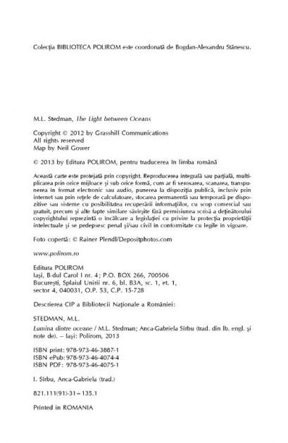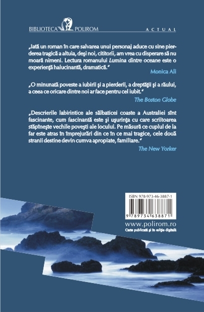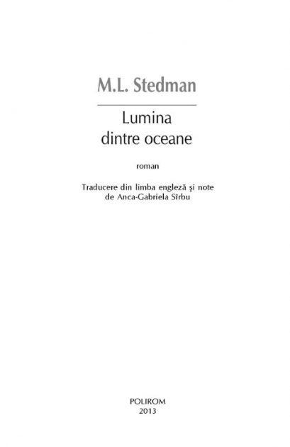 Traducere din limba engleza si note de Anca‑Gabriela Sirbu O devastatoare poveste de iubire intr-o lume fara raspunsuri sigure Devenita bestseller, Lumina dintre oceane a fost desemnata cea mai buna carte a lunii august 2012 de Amazon.com, unanim considerata un debut spectaculos al scriitoarei de origine australiana M.L. Stedman. Dupa patru ani de cosmar petrecuti pe fronturile Primului Razboi Mondial, Tom Sherbourne se intoarce in tara natala, Australia, angajindu-se paznic de far pe Ianus Rock, o insula aflata la distanta de o jumatate de zi de coasta. Izolati de restul lumii, Tom si frumoasa lui sotie, Isabel, incearca zadarnic sa devina parinti. Cind orice speranta parea pierduta, pe tarm esueaza o barca ducind un cadavru si un nou-nascut. Incalcindu-si principiile, Tom si Isabel decid sa pastreze copilul, considerindu-l un dar de la Dumnezeu. Dupa doi ani, cind se intorc pe continent, descopera ca hotarirea luata le-a schimbat iremediabil destinele. „Iata un roman in care salvarea unui personaj aduce cu sine pierderea tragica a altuia, desi noi, cititorii, am vrea cu disperare sa nu moara nimeni. Lectura romanului Lumina dintre oceane este o experienta halucinanta, dramatica.” (Monica Ali) „O minunata poveste a iubirii si a pierderii, a dreptatii si a raului, a ceea ce oricare dintre noi ar face pentru cel iubit.” (The Boston Globe) „Descrierile labirintice ale salbaticei coaste a Australiei sint fascinante, cum fascinanta este si usurinta cu care scriitoarea stapineste vechile povesti ale locului. Pe masura ce cuplul de la far este atras in imprejurari din ce in ce mai tragice, cele doua stranii destine devin cumva apropiate, familiare.” (The New Yorker) Carte recomandata de