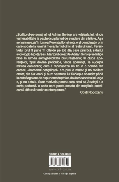 de manele, cu gasti, drogati si ramificatii mafiote. „Scriitorul-personaj al lui Adrian Schiop are vrajeala lui, vinde vulnerabilitate la pachet cu planuri de evadare din saracie. Asa se insinueaza in lumea Ferentarilor si asta e si combinatia prin care scoate la lumina mecanismul cinic al restului lumii. Ferentariul brut ii pune in offside pe toti aia care practica safariul sociologic hipstaresc. Martorul creat de Adrian Schiop se infige bine in lumea semighetoizata bucuresteana; in ciuda aparentelor, tipul devine periculos, vinde speranta, le suceste mintea oamenilor, cum ii reproseaza un tip la o bomba din cartier. «Borcanul constiintei» are pus la murat si un realism onest, din ala vechi si bun: naratorul lui Schiop e obsedat pina la autoflagelare de expunerea faptelor, de demascarea lui «asa e, si nu altfel». Sint motivele pentru care cred ca Soldatii e o carte perfecta, o carte care poate scoate din motaiala estetizanta cititorul roman contemporan.” (Costi Rogozanu)