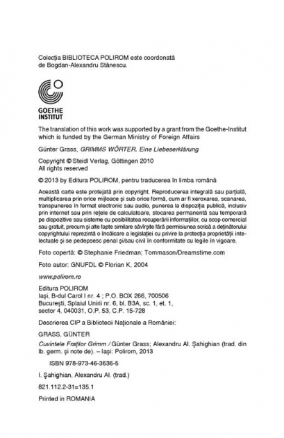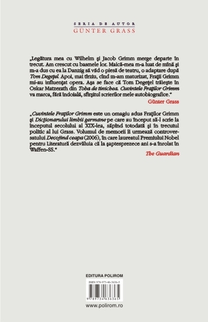 Traducere din limba germana si note de Alexandru Al. Sahighian Premiul Nobel pentru Literatura 1999 Cuvintele Fratilor Grimm (2010), cel de-al treilea volum de memorii al lui Gunter Grass, foloseste drept pretext cuvintele propuse de Jacob si Wilhelm Grimm in Dictionarul limbii germane pentru a se intoarce in timp si a rememora diverse episoade din viata celor doi frati, dar si din trecutul autorului insusi. Cind sobra, cind hitra, presarata cu digresiuni intortocheate, jocuri de cuvinte sclipitoare si turnuri de fraza ingenioase, naratiunea urmareste viata atit de celebrilor Frati Grimm, ale caror povesti sint cunoscute astazi pina in cele mai indepartate colturi ale lumii – ne sint dezvaluite firile si aspiratiile lor diferite, li se confera substanta, iar cititorii ajung sa-i vada aievea, ca pe doi oameni in carne si oase. Dictionarul limbii germane, publicat intre anii 1852 si 1960 in treizeci si doua de volume, inceput de Jacob si Wilhelm Grimm la propunerea editorilor Karl Reimer si Salomon Hirzel si continuat de numerosi colaboratori, devine astfel nu doar o insiruire monotona de cuvinte, ci si o tesatura vie de vocabule vechi si noi, folosite inca sau date uitarii, in care se impletesc soaptele, ezitarile, stradaniile, revoltele, slabiciunile si bucuriile celor doi frati. „Legatura mea cu Wilhelm si Jacob Grimm merge departe in trecut. Am crescut cu basmele lor. Maica-mea m-a luat de mina si m-a dus cu ea la Danzig sa vad o piesa de teatru, o adaptare dupa Tom Degetel. Apoi, mai tirziu, cind m-am maturizat, Fratii Grimm mi-au influentat opera. Asa se face ca Tom Degetel traieste in Oskar Matzerath din Toba de tinichea. Cuvintele Fratilor Grimm va marca, fara indoiala, sfirsitul scrierilor mele autobiografice.” (Gunter Grass) „Cuvintele Fratilor Grimm este un omagiu adus Fratilor Grimm si Dictionarului limbii germane pe care au inceput sa-l scrie la inceputul secolului al XIX-lea, sapind totodata si in trecutul politic al lui Grass. Volumul de memorii ii urmeaza controversatului Decojind ceapa (2006), in care laureatul Premiului Nobel pentru Literatura dezvaluia ca la saptesprezece ani s-a inrolat in Waffen-SS.” (The Guardian)