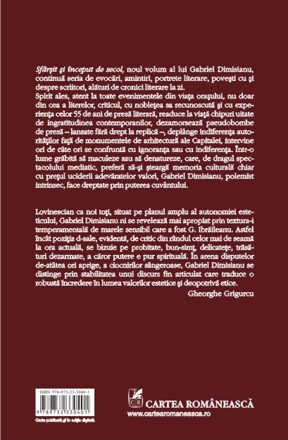 Sfirsit si inceput de secol, noul volum al lui Gabriel Dimisianu, continua seria de evocari, amintiri, portrete literare, povesti cu si despre scriitori, alaturi de cronici literare la zi. Spirit ales, atent la toate evenimentele din viata orasului, nu doar din cea a literelor, criticul, cu nobletea sa recunoscuta si cu experienta celor 55 de ani de presa literara, readuce la viata chipuri uitate de ingratitudinea contemporanilor, dezamorseaza pseudobombe de presa – lansate fara drept la replica –, deplinge indiferenta autoritatilor fata de monumentele de arhitectura ale Capitalei, intervine ori de cite ori se confrunta cu ignoranta sau cu indiferenta. Intr-o lume grabita sa maculeze sau sa denatureze, care, de dragul spec-tacolului mediatic, prefera sa-si stearga memoria culturala chiar cu pretul uciderii adevaratelor valori, Gabriel Dimisianu, polemist intrinsec, face dreptate prin puterea cuvintului. „Lovinescian ca noi toti, situat pe planul amplu al autonomiei esteticului, Gabriel Dimisianu ni se reveleaza mai apropiat prin textura-i temperamentala de marele sensibil care a fost G. Ibraileanu. Astfel incit pozitia d-sale, evidenta, de critic din rindul celor mai de seama la ora actuala, se bizuie pe probitate, bun-simt, delicatete, trasaturi dezarmate, a caror putere e pur spirituala. In arena disputelor de-atitea ori aprige, a ciocnirilor singeroase, Gabriel Dimisianu se distinge prin stabilitatea unui discurs fin articulat care traduce o robusta incredere in lumea valorilor estetice si deopotriva etice.” (Gheorghe Grigurcu)