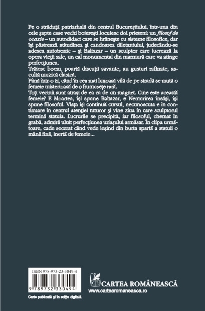 Pe o straduta patriarhala din centrul Bucurestiului, intr-una din cele sapte case vechi boieresti locuiesc doi prieteni: un filosof de ocazie – un autodidact care se hraneste cu sisteme filosofice, dar isi pastreaza atitudinea si candoarea diletantului, judecindu-se adesea autoironic – si Baltazar – un sculptor care lucreaza la opera vietii sale, un cal monumental din marmura care va atinge perfectiunea. Traiesc boem, poarta discutii savante, au gusturi rafinate, asculta muzica clasica. Pina intr-o zi, cind in cea mai luxoasa vila de pe strada se muta o femeie misterioasa de o frumusete rara. Toti vecinii sint atrasi de ea ca de un magnet. Cine este aceasta femeie? E Moartea, isi spune Baltazar, e Nemurirea insasi, isi spune filosoful. Viata isi continua cursul, necunoscuta e in continuare in centrul atentiei tuturor si vine ziua in care sculptorul termina statuia. Lucrurile se precipita, iar filosoful, chemat in graba, admira uluit perfectiunea uriasului armasar. In clipa urmatoare, cade secerat cind vede iesind din burta sparta a statuii o mina fina, inerta de femeie...