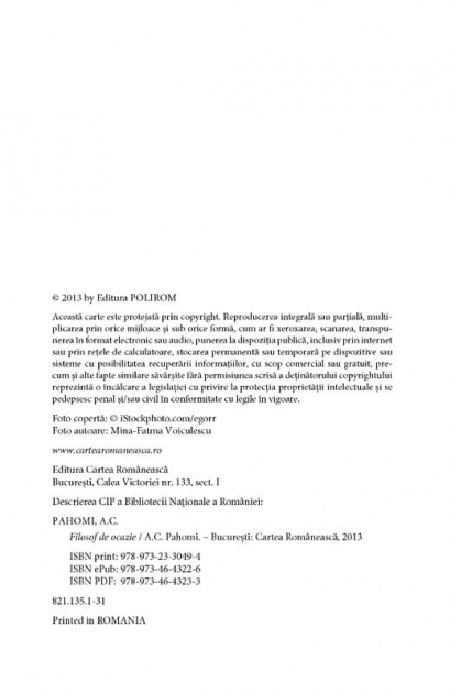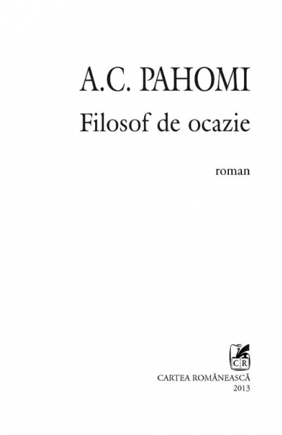 Comandă online cartea "Filosof de ocazie" la 10,60 lei isbn 9789732330494 scrisă de A. C. Pahomi , A.C. Pahomi, tiparită la editura Polirom face parte din colecția Cartea romaneasca. cu plata ramburs sau online cu cardul. Momentan titlul "Filosof de ocazie" nu este disponibil însa vă puteți înscrie pentru a fi notificat în momenul reaprovizionarii.