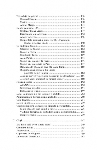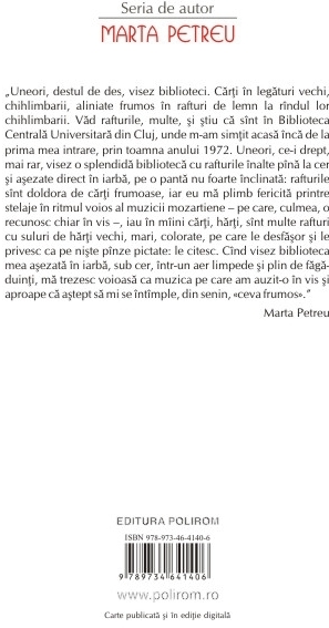 O colectie de eseuri pe teme dintre cele mai variate, ce beneficiaza de aceeasi abordare nuantata si atenta la detalii cu care Marta Petreu si-a obisnuit deja cititorii. De la Matei Calinescu la Norman Manea, de la Rotonda plopilor aprinsi a lui Valeriu Anania la corespondenta si jurnalele lui Mihail Bulgakov, personalitati marcante si opere din literatura romana si universala sint analizate cu argumente pertinente si puncte de vedere nu de putine ori surprinzatoare. O addenda cuprinde prelegerea sustinuta de autoare in cadrul unui simpozion pe marginea receptarii de catre critici a volumului Diavolul si ucenicul sau: Nae Ionescu – Mihail Sebastian. „Uneori, destul de des, visez biblioteci. Carti in legaturi vechi, chihlimbarii, aliniate frumos in rafturi de lemn la rindul lor chihlimbarii. Vad rafturile, multe, si stiu ca sint in Biblioteca Centrala Universitara din Cluj, unde m-am simtit acasa inca de la prima mea intrare, prin toamna anului 1972. Uneori, ce-i drept, mai rar, visez o splendida biblioteca cu rafturile inalte pina la cer si asezate direct in iarba, pe o panta nu foarte inclinata: rafturile sint doldora de carti frumoase, iar eu ma plimb fericita printre stelaje in ritmul voios al muzicii mozartiene – pe care, culmea, o recunosc chiar in vis –, iau in miini carti, harti, sint multe rafturi cu suluri de harti vechi, mari, colorate, pe care le desfasor si le privesc ca pe niste pinze pictate: le citesc. Cind visez biblioteca mea asezata in iarba, sub cer, intr-un aer limpede si plin de fagaduinti, ma trezesc voioasa ca muzica pe care am auzit-o in vis si aproape ca astept sa mi se intimple, din senin, «ceva frumos».” (Marta Petreu) Din cuprins: Lovinescu • Zaciu, schite pentru portret • Malancioiu sau femeia care seamana cu Antigona • Cu si despre Cioran • Patapievici sau discurs asupra metodei • Comunismul prin concepte si biografii neromantate • Romania lui Moshe Idel