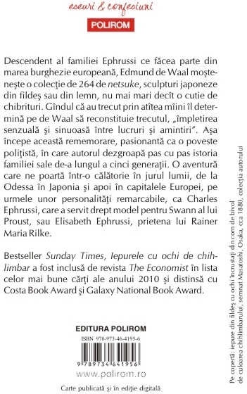 Traducere de Ioana Aneci Bestseller Sunday Times, Iepurele cu ochi de chihlimbar a fost inclusa de revista The Economist in lista celor mai bune carti ale anului 2010 si distinsa cu Costa Book Award si Galaxy National Book Award. Descendent al familiei Ephrussi ce facea parte din marea burghezie europeana, Edmund de Waal mosteneste o colectie de 264 de netsuke, sculpturi japoneze din fildes sau din lemn, nu mai mari decit o cutie de chibrituri. Gindul ca au trecut prin atitea miini il determina pe de Waal sa reconstituie trecutul, „impletirea senzuala si sinuoasa intre lucruri si amintiri”. Asa incepe aceasta rememorare, pasionanta ca o poveste politista, in care autorul dezgroapa pas cu pas istoria familiei sale de-a lungul a cinci generatii. O aventura care ne poarta intr-o calatorie in jurul lumii, de la Odessa in Japonia si apoi in capitalele Europei, pe urmele unor personalitati remarcabile, ca Charles Ephrussi, care a servit drept model pentru Swann al lui Proust, sau Elisabeth Ephrussi, prietena lui Rainer Maria Rilke. „Aveti in miini o capodopera.” (Frances Wilson, Sunday Times)