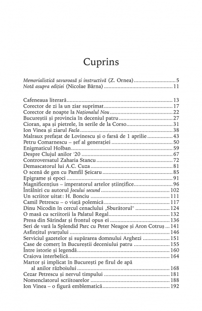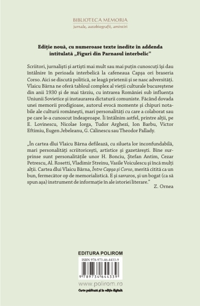 Editia a III-a adaugita Prefata de Z. Ornea Nota asupra editiei de Nicolae Barna Editie noua, cu numeroase texte inedite in addenda intitulata „Figuri din Parnasul interbelic” Scriitori, jurnalisti si artisti mai mult sau mai putin cunoscuti isi dau intilnire in perioada interbelica la cafeneaua Capsa ori braseria Corso. Aici se discuta politica, se leaga prietenii si se nasc adversitati. Vlaicu Barna ne ofera tabloul complex al vietii culturale bucurestene din anii 1930 si de mai tirziu, cu intrarea Romaniei sub influenta Uniunii Sovietice si instaurarea dictaturii comuniste. Facind dovada unei memorii prodigioase, autorul evoca momente si chipuri notabile ale culturii romanesti, mari personalitati cu care a colaborat sau pe care le-a cunoscut indeaproape. Ii intilnim astfel, printre altii, pe E. Lovinescu, Nicolae Iorga, Tudor Arghezi, Ion Barbu, Victor Eftimiu, Eugen Jebeleanu, G. Calinescu sau Theodor Pallady. „In cartea dlui Vlaicu Barna defileaza, cu silueta lor inconfundabila, mari personalitati scriitoricesti, artistice si gazetaresti. Bine sur-prinse sint personalitatile unor H. Bonciu, Stefan Antim, Cezar Petrescu, Al. Rosetti, Vladimir Streinu, Vasile Voiculescu si inca multi altii. Cartea dlui Vlaicu Barna, Intre Capsa si Corso, merita citita ca un bun, fermecator op de memorialistica. E si savuros, si un bogat (ca sa spun asa) instrument de informatie in ale istoriei literare.” (Z. Ornea)