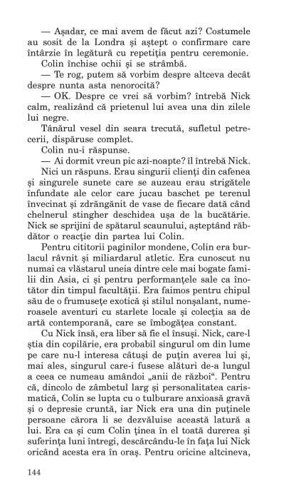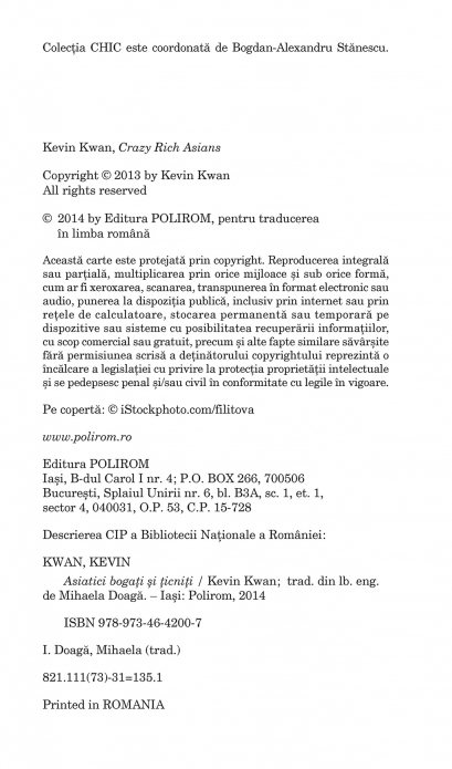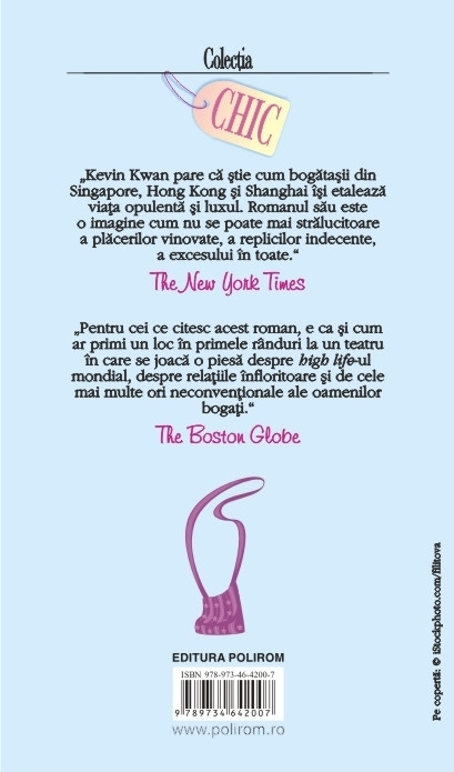 Traducere din limba engleza de Mihaela Doaga Romanul ne dezvaluie lumea putin cunoscuta a expatilor chinezi din Singapore, detinatori ai unor averi fabuloase. Cind Rachel Chu, asiatica nascuta in Statele Unite, este invitata de prietenul ei, Nick Young, sa-l insoteasca la ceea ce se anunta a fi nunta anului in Singapore, tinara universitara nici nu stie ce-o asteapta! Rachel descopera brusc ca familia barbatului cu care spera sa se marite intr-o buna zi locuieste intr-o casa care aduce mai degraba a palat, ca va fi invitata sa calatoreasca mai degraba in avioane private decit cu masina si, cireasa de pe tort, ca tinarul de la bratul ei e unul dintre cei mai doriti burlaci din Asia. Si atunci nu e de mirare ca Rachel va deveni in curind tinta tuturor birfelor si intrigilor imaginabile, caci marile familii din oras si-l doresc drept ginere pe Nick, mostenitorul unei averi colosale. Tratind cu fina ironie lumea opulenta si putin cunoscuta a nouveau-riche-ilor asiatici, romanul lui Kevin Kwan este mortal de nostim si captivant, pentru ca, nu-i asa, cine nu-si doreste sa fie tinar, indragostit si superbogat? „Kevin Kwan pare ca stie cum bogatasii din Singapore, Hong Kong si Shanghai isi etaleaza viata opulenta si luxul. Romanul sau este o imagine cum nu se poate mai stralucitoare a placerilor vinovate, a replicilor indecente, a excesului in toate.” (The New York Times) „Pentru cei ce citesc acest roman, e ca si cum ar primi un loc in primele rinduri la un teatru in care se joaca o piesa despre high life-ul mondial, despre relatiile infloritoare si de cele mai multe ori neconventionale ale oamenilor bogati.” (The Boston Globe) Carte recomandata de