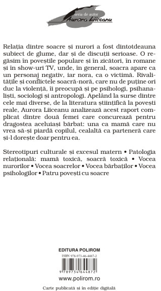 Relatia dintre soacre si nurori a fost dintotdeauna subiect de glume, dar si de discutii serioase. O regasim in povestile populare si in zicatori, in romane si in show-uri TV, unde, in general, soacra apare ca un personaj negativ, iar nora, ca o victima. Rivalitatile si conflictele soacra-nora, care nu de putine ori duc la violenta, ii preocupa si pe psihologi, psihanalisti, sociologi si antropologi. Apelind la surse dintre cele mai diverse, de la literatura stiintifica la povesti reale, Aurora Liiceanu analizeaza acest raport complicat dintre doua femei care concureaza pentru dragostea aceluiasi barbat: una ca mama care nu vrea sa-si piarda copilul, cealalta ca partenera care si-l doreste doar pentru ea. Din cuprins: Stereotipuri culturale si excesul matern • Patologia relationala: mama toxica, soacra toxica • Vocea nurorilor • Vocea soacrelor • Vocea barbatilor • Vocea psihologilor • Patru povesti cu soacre