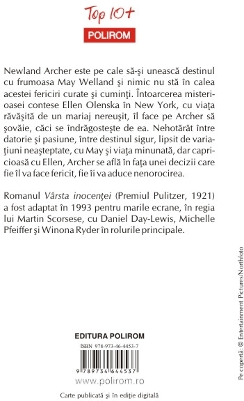 Traducere din limba engleza de Sanda Retinschi Romanul Virsta inocentei (Premiul Pulitzer, 1921) a fost adaptat in 1993 pentru marile ecrane, in regia lui Martin Scorsese, cu Daniel Day-Lewis, Michelle Pfeiffer si Winona Ryder in rolurile principale. Newland Archer este pe cale sa-si uneasca destinul cu frumoasa May Welland si nimic nu sta in calea acestei fericiri curate si cuminti. Intoarcerea misterioasei contese Ellen Olenska in New York, cu viata ravasita de un mariaj nereusit, il face pe Archer sa sovaie, caci se indragosteste de ea. Nehotarit intre datorie si pasiune, intre destinul sigur, lipsit de variatiuni neasteptate, cu May si viata minunata, dar capricioasa cu Ellen, Archer se afla in fata unei decizii care fie il va face fericit, fie ii va aduce nenorocirea.