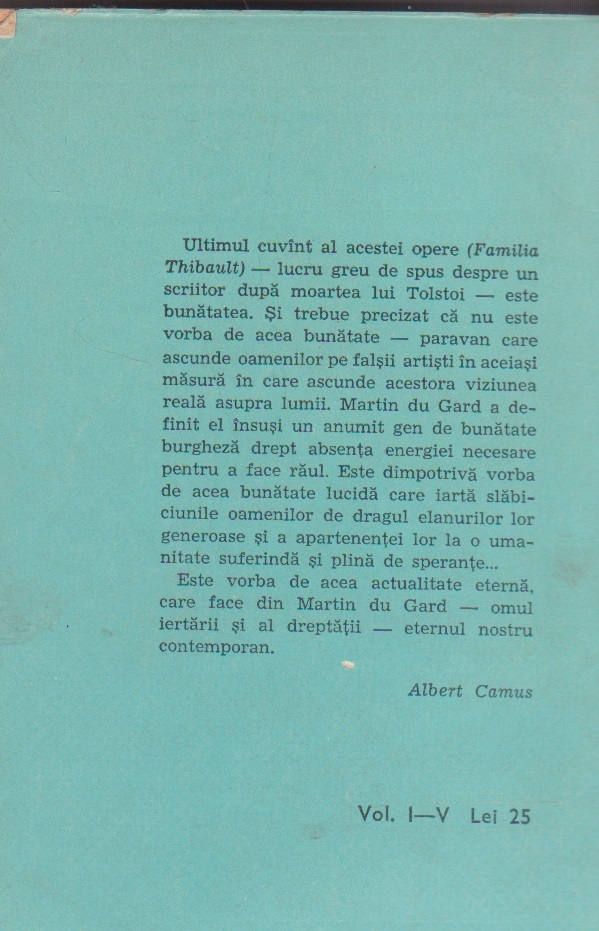 Comandă online cartea "Familia Thibault, Volumul al IV-lea" la 10,50 lei scrisă de ROGER MARTIN DU GARD Vintila Russu Sirianu, tiparită la editura Pentru Literatura face parte din colecția Biblioteca pentru toti. cu plata ramburs sau online cu cardul. Momentan titlul "Familia Thibault, Volumul al IV-lea" nu este disponibil însa vă puteți înscrie pentru a fi notificat în momenul reaprovizionarii.