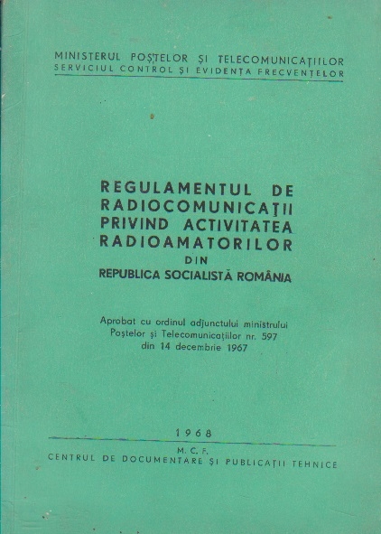 Comandă online cartea "Regulamentul de radiocomunicatii privind activitatea radioamatorilor din Republica Socialista Romania" la 6,20 lei Ministerul Postelor si Telecomunicatiilor, tiparită la editura Centrul de documentare si publicatii tehnice M.C.F. în anul 1968 cu un număr de 88 pagini. cu plata ramburs sau online cu cardul. Momentan titlul "Regulamentul de radiocomunicatii privind activitatea radioamatorilor din Republica Socialista Romania" nu este disponibil însa vă puteți înscrie pentru a fi notificat în momenul reaprovizionarii.