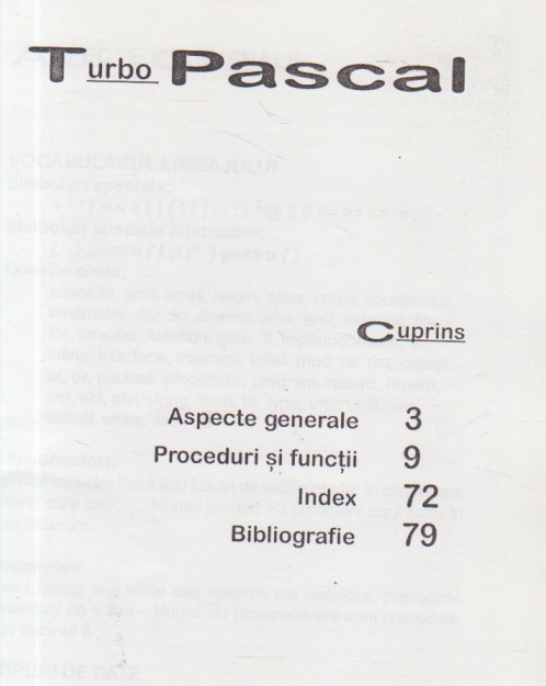 Comandă online cartea "Turbo Pascal - Caiet de Laborator" la 6,20 lei cu un număr de 79 pagini categorie Programare, Calculatoare / IT. cu plata ramburs sau online cu cardul. Momentan titlul "Turbo Pascal - Caiet de Laborator" nu este disponibil însa vă puteți înscrie pentru a fi notificat în momenul reaprovizionarii.