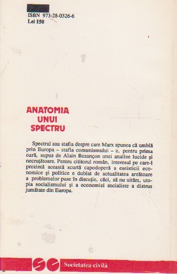 Comandă online cartea "Anatomia unui spectru" la 6,20 lei scrisă de Alain Besancon în anul 1992 cu un număr de 109 pagini categorie Istoria Europei, Istorie. cu plata ramburs sau online cu cardul. Momentan titlul "Anatomia unui spectru" nu este disponibil însa vă puteți înscrie pentru a fi notificat în momenul reaprovizionarii.