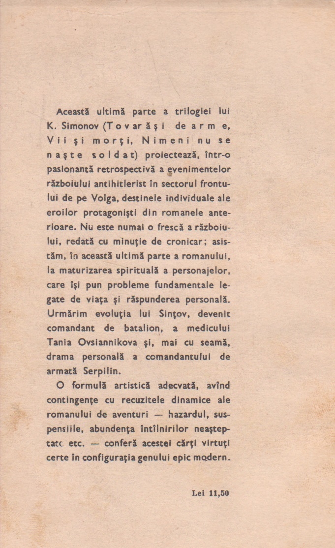 Comandă online cartea "Nimeni nu se naste soldat, Volumul al II-lea" la 15,90 lei scrisă de Konstantin Simonov Eugen Barbu , Vladimir Cogan, tiparită la editura Editura pentru Literatura Universala în anul 1966. cu plata ramburs sau online cu cardul. Momentan titlul "Nimeni nu se naste soldat, Volumul al II-lea" nu este disponibil însa vă puteți înscrie pentru a fi notificat în momenul reaprovizionarii.