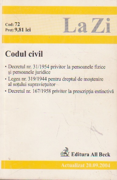 Comandă online cartea "Codul civil. Actualizat 20.09.2004" la 10,50 lei, tiparită la editura All Beck face parte din colecția La Zi în anul 2004 cu un număr de 258 pagini. cu plata ramburs sau online cu cardul. Momentan titlul "Codul civil. Actualizat 20.09.2004" nu este disponibil însa vă puteți înscrie pentru a fi notificat în momenul reaprovizionarii.