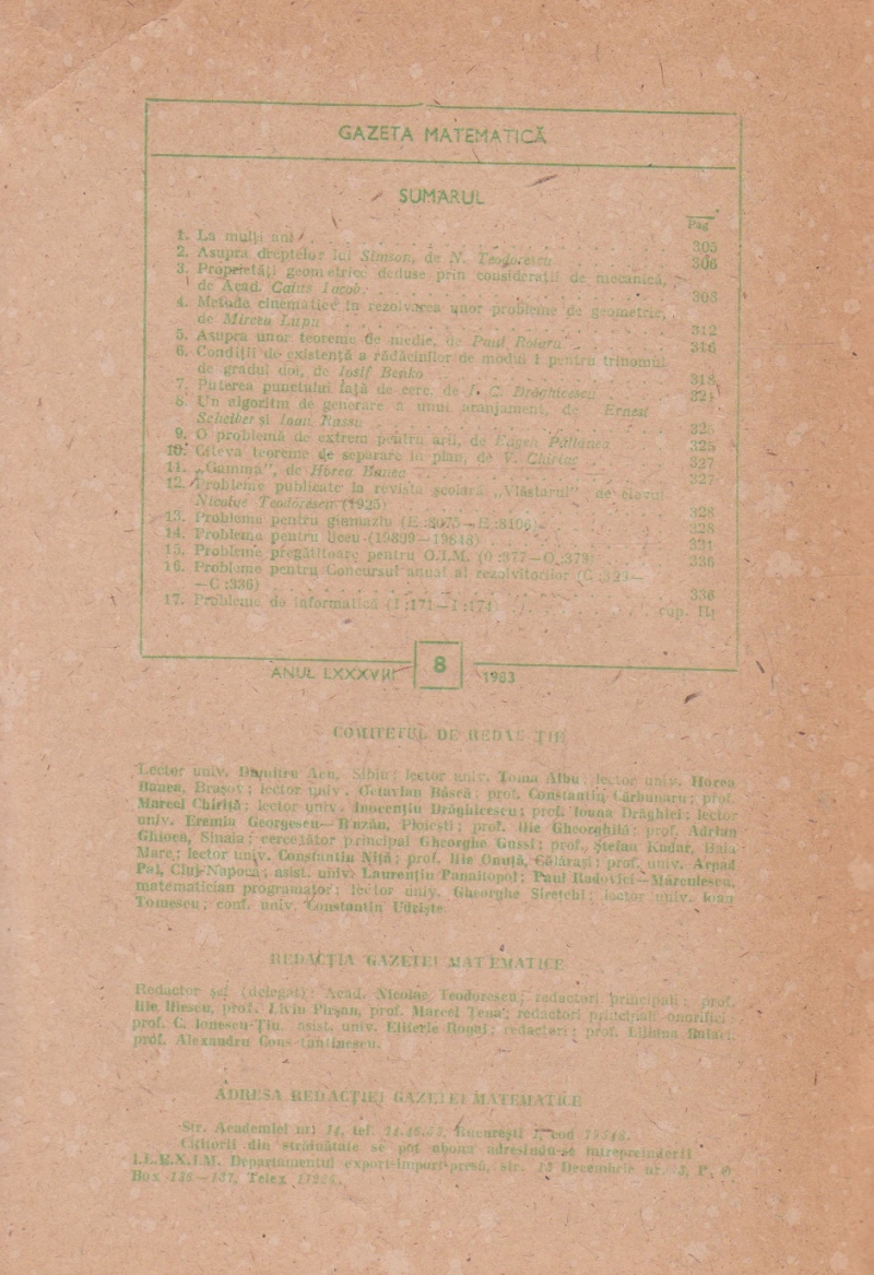 Comandă online cartea "Gazeta Matematica, 8/1983" la 3,10 lei Societatea de Stiinte Matematice din Romania, tiparită la editura Gazeta Matematica face parte din colecția Gazeta Matematica în anul 1983. cu plata ramburs sau online cu cardul. Momentan titlul "Gazeta Matematica, 8/1983" nu este disponibil însa vă puteți înscrie pentru a fi notificat în momenul reaprovizionarii.