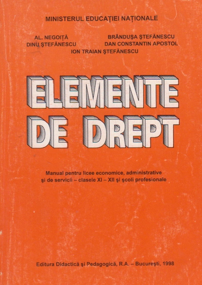 Comandă online cartea "Elemente de drept. Manual pentru licee economice, administrative si de servicii - clasele XI-XII si scoli profesionale" la 10,50 lei scrisă de Al. Negoita, tiparită la editura Didactica si Pedagogica în anul 1998 cu un număr de 284 pagini. cu plata ramburs sau online cu cardul. Momentan titlul "Elemente de drept. Manual pentru licee economice, administrative si de servicii - clasele XI-XII si scoli profesionale" nu este disponibil însa vă puteți înscrie pentru a fi notificat în momenul reaprovizionarii.