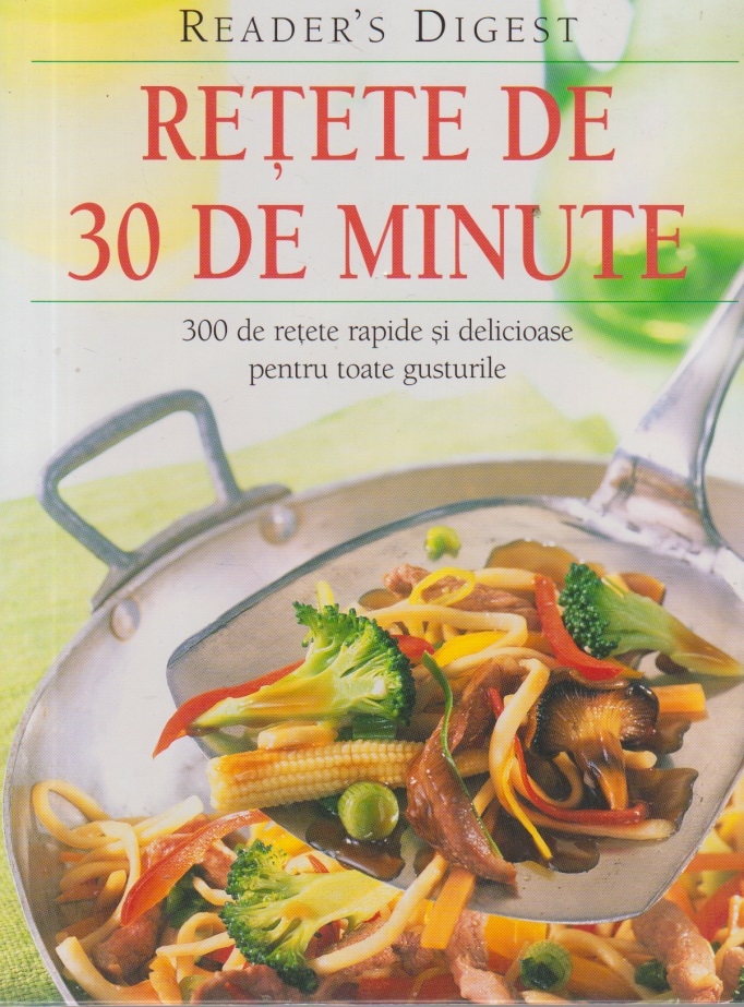 Toate retetele din Retete de 30 de minute pot fi preparate in mai putin de jumatate de ora. Mai mult decat atat: este vorba de feluri de mancare delicioase si sanatoase, pentru ca atunci cand ingredientele sunt preparate termic cat mai putin timp, retin cat mai mult din prospetime si din elementele nutritive. Veti descoperi in aceasta carte peste 300 de retete testate de experti pentru a va garanta ca pot fi facute in 30 de minute. Retetele sunt insotite de fotografii si instructiuni clare pas cu pas, pe langa sfaturi de la profesionisti legate de metode de economisire a timpului petrecut in bucatarie.