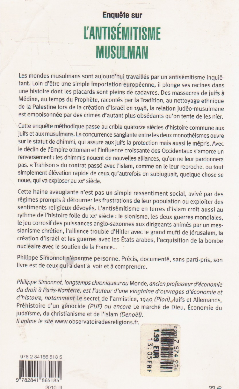 Comandă online cartea "Enquete sur l antisemitisme musulman de ses origines a nos jours" la 20,10 lei scrisă de Philippe Simonnot, tiparită la editura Michalon în anul 2010 cu un număr de 318 pagini. Livrare din stoc cu plata ramburs sau online cu cardul.