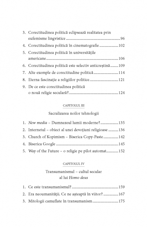 Trăim într-o lume în care religiozitatea capătă valenţe nemaiîntîlnite de cînd valul secularizării a cuprins Occidentul şi se răspîndeşte la nivel global. În volumul său, Nicu Gavriluţă analizează ruptura dintre religiile tradiţionale şi noile religii seculare, care tind să se generalizeze şi să aducă schimbări majore în viaţa noastră. Internetul, finanţele, noua mass-media, corectitudinea politică, transumanismul sau postumanismul aduc modificări radicale în politică, în societate şi în mediile universitare, creînd noi religii, cu zei încă necunoscuţi. Dar este oare aceasta direcţia pe care ne-o dorim? Noile religii seculare ridică unele întrebări privind calea pe care am decis să o urmăm şi încearcă să aducă lumină în privinţa lucrurilor pozitive sau negative care ne-ar putea aştepta la capătul drumului.