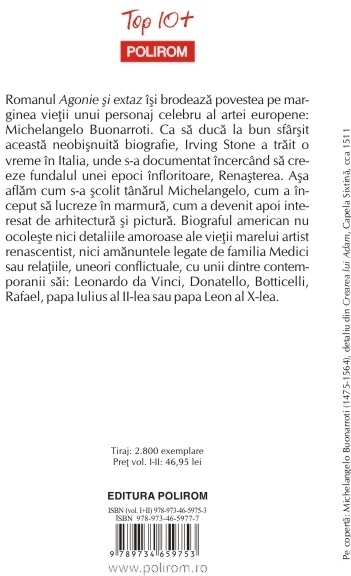 Traducere din limba engleza si note de Liana Dobrescu si Geo Dumitrescu Agonie si extaz a dat in 1965 titlul unei ecranizari celebre, in regia lui Carol Reed, cu Charlton Heston si Rex Harrison in rolurile principale. Romanul Agonie si extaz isi brodeaza povestea pe marginea vietii unui personaj celebru al artei europene: Michelangelo Buonarroti. Ca sa duca la bun sfirsit aceasta neobisnuita biografie, Irving Stone a trait o vreme in Italia, unde s-a documentat incercind sa creeze fundalul unei epoci infloritoare, Renasterea. Asa aflam cum s-a scolit tinarul Michelangelo, cum a inceput sa lucreze in marmura, cum a devenit apoi interesat de arhitectura si pictura. Biograful american nu ocoleste nici detaliile amoroase ale vietii marelui artist renascentist, nici amanuntele legate de familia Medici sau relatiile, uneori conflictuale, cu unii dintre contemporanii sai: Leonardo da Vinci, Donatello, Botticelli, Rafael, papa Iulius al II-lea sau papa Leon al X-lea. „Pentru Rafael, crearea unei opere de arta e o zi stralucitoare de primavara in Campagna; pentru mine, e tramontana mugind la vale de pe culmile muntelui. Lucrez din zori pina-n noapte, adeseori la lumina luminarii sau a lampii cu ulei. Arta pentru mine e un chin, o agonie cind merge rau, un extaz cind merge bine; dar intotdeauna ma subjuga. Cind termin o zi de lucru sint ca o pastaie seaca. Tot ce-a fost in mine se afla acum in marmura sau in fresca. Iata de ce n-am nimic de dat in alta parte.”