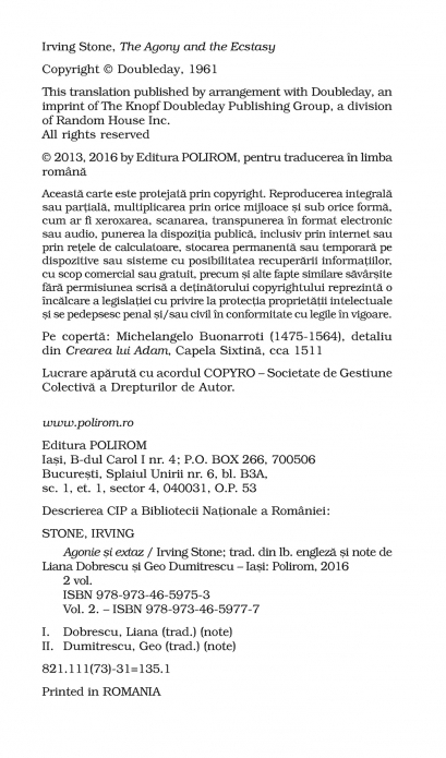 Comandă online cartea "Agonie și extaz (2 vol, ediţie de buzunar)" la 52,80 lei isbn 9789734659753 scrisă de Irving Stone , Irving Stone, tiparită la editura Polirom face parte din colecția Top 10+. Cartea poate fi livrată în circa 2 zile cu plata ramburs sau online cu cardul.