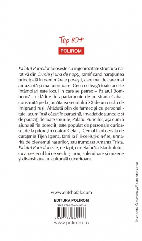 Comandă online cartea "Palatul Puricilor (ediţie de buzunar)" la 36,90 lei isbn 9789734669226 scrisă de Elif Shafak, tiparită la editura Polirom face parte din colecția Top 10+. Cartea poate fi livrată în circa 2 zile cu plata ramburs sau online cu cardul.