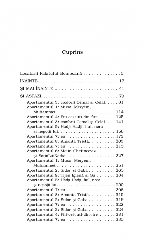 Palatul Puricilor foloseşte cu ingeniozitate structura narativă din O mie şi una de nopţi, ramificînd naraţiunea principală în nenumărate poveşti, care mai de care mai amuzantă şi mai uimitoare. Ceea ce leagă toate aceste întîmplări este locul în care se petrec – Palatul Bomboană, o clădire de apartamente de pe strada Cabal, construită pe la jumătatea secolului XX de un cuplu de imigranţi ruşi. Altădată plin de farmec şi cu personalitate, acum însă căzut în paragină, invadat de gunoaie şi de paraziţi de toate soiurile, Palatul Puricilor, aşa cum a ajuns să fie poreclit, este populat de personaje curioase, de la pitoreştii coafori Celal şi Cemal la obsedata de curăţenie Tijen Igienă, familia Fiii-cei-iuţi-din-fire, urmărită de blestemul nasurilor, sau frumoasa Amanta Tristă. Palatul Puricilor este, de fapt, o metaforă a Istanbulului, cu amestecul lui de vechi şi nou, splendoare şi mizerie şi diversitatea lui culturală cuceritoare.