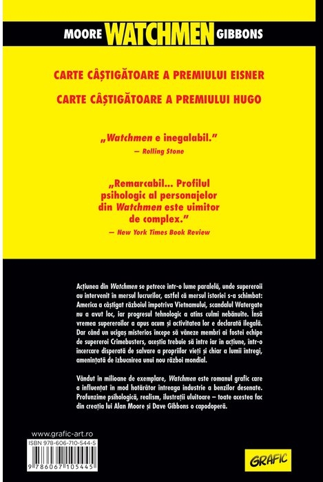 Vândut în milioane de exemplare, Watchmen este romanul grafic care a influențat în mod hotărâtor întreaga industrie a benzilor desenate. Profunzime psihologică, realism, ilustrații uluitoare - toate acestea fac din creația lui Allan Moore și Dave Gibbons o capodoperă.