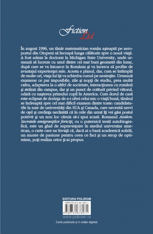 În august 1996, un tînăr matematician român aşteaptă pe aeroportul din Otopeni să înceapă lunga călătorie spre o nouă viaţă. A fost admis la doctorat la Michigan State University, unde urmează să lucreze cu unul dintre cei mai buni geometri din lume, după care se va întoarce în România şi va încerca să profite de avantajul experienţei sale. Acesta e planul, dar, cum se întîmplă de multe ori, viaţa lui îşi va schimba cursul pe nesimţite. Urmează examene ce par imposibile, zile şi nopţi de studiu, prea multă cafea, adaptarea la o altfel de societate, interacţiunea cu românii şi străinii din campus, dar şi un punct de cotitură privind viitorul, odată cu naşterea primului copil în America. Cum dorul de casă este eclipsat de dorinţa de a-i oferi celui mic o viaţă bună, tînărul se îndreaptă spre cel mai dificil examen dintre toate: candidaturile la sute de universităţi din SUA şi Canada, care necesită nervi de oţel şi credinţa neclintită că în cele din urmă îţi vei găsi postul potrivit şi un nou loc căruia să-i spui acasă. Romanul Avalon. Secretele emigranţilor fericiţi, cu o puternică tentă autobiografică, este un ghid de supravieţuire în mediul universitar american, o carte care ne învaţă că, dacă ai o bază academică solidă, un munte de pasiune pentru ceea ce faci şi un strop de optimism, poţi realiza orice ţi-ai propus.