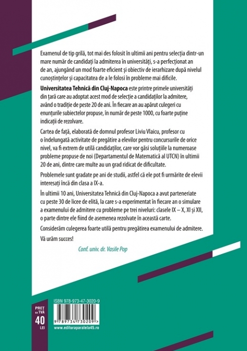 Cartea de faţă, elaborată de domnul profesor Liviu Vlaicu, profesor cu o îndelungată activitate de pregătire a elevilor pentru concursurile de orice nivel, va fi extrem de utilă candidaţilor, care vor găsi soluţiile la numeroase probleme propuse de noi (Departamentul de Matematică al UTCN) în ultimii 20 de ani, dintre care multe au un grad ridicat de dificultate.