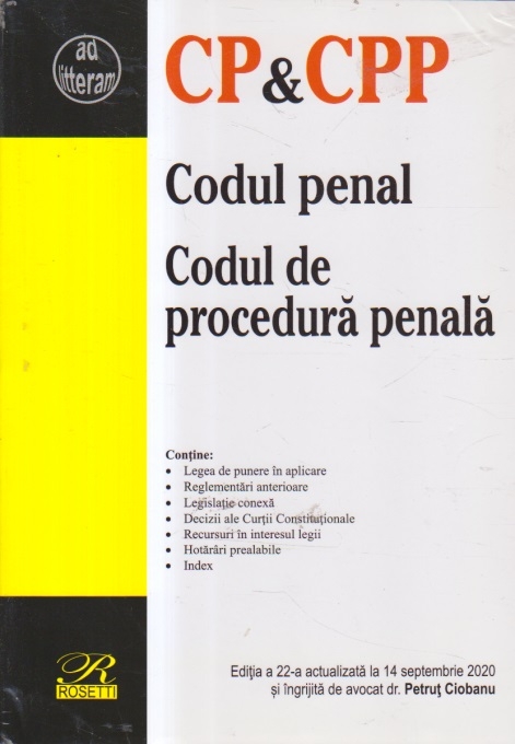 Comandă online cartea "Codul penal. Codul de procedura penala. Editia a 22-a actualizata la 14 septembrie 2020" la 26,40 lei scrisă de Petrut Ciobanu, tiparită la editura Rosetti în anul 2020 cu un număr de 528 pagini. cu plata ramburs sau online cu cardul. Momentan titlul "Codul penal. Codul de procedura penala. Editia a 22-a actualizata la 14 septembrie 2020" nu este disponibil însa vă puteți înscrie pentru a fi notificat în momenul reaprovizionarii.