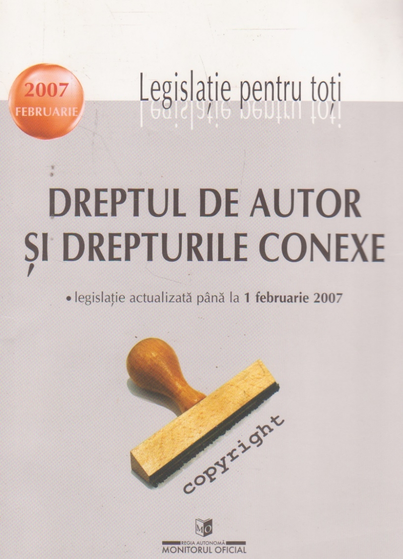 Comandă online cartea "Dreptul de autor si drepturile conexe. Legislatie actualizata pana la 1 februarie 2007" la 15,90 lei, tiparită la editura Regia Autonoma Monitorul Oficial în anul 2007 cu un număr de 296 pagini categorie Coduri si legi comentate, Drept. cu plata ramburs sau online cu cardul. Momentan titlul "Dreptul de autor si drepturile conexe. Legislatie actualizata pana la 1 februarie 2007" nu este disponibil însa vă puteți înscrie pentru a fi notificat în momenul reaprovizionarii.
