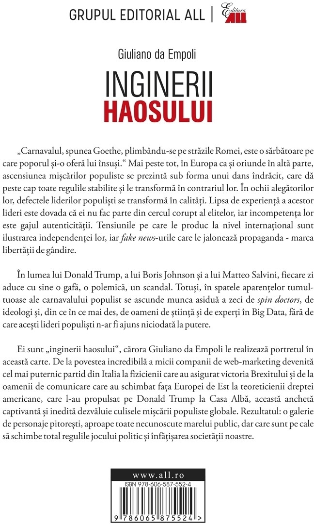 Inginerii haosului merită un loc de cinste pe lista lecturilor obligatorii pentru toți cei dornici să înțeleagă din ce stofă este croită istoria recentă a lumii occidentale. În urma unei anchete captivante și inedite, Giuliano da Empoli scoate la lumină noua paradigmă a vieții politice globale.