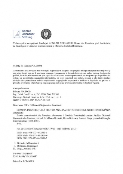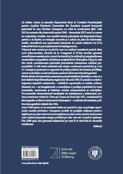 Volum aparut cu sprijinul Fundatiei KONRAD ADENAUER, Biroul din Romania, si al Institutului de Investigare a Crimelor Comunismului si Memoria Exilului Romanesc. „Al doilea volum al anexelor Raportului final al Comisiei Prezidentiale pentru Analiza Dictaturii Comuniste din Romania acopera inceputul perioadei in care Nicolae Ceausescu s-a aflat la conducerea tarii. Cele 102 documente din intervalul martie 1965 – decembrie 1971 sint, in marea lor majoritate, inedite. Am urmarit temele principale ale Raportului final, pentru a le ilustra cu exemple concrete si a aduce un plus de informatie. Astfel, cercetatorii sau persoanele interesate de aceste subiecte vor fi in masura sa faca un pas suplimentar in intelegerea lor. Volumul este centrat pe modul in care s-a realizat transferul puterii catre noul prim-secretar, devenit de la Congresul al IX-lea secretar general; consolidarea acesteia prin cumul de functii si de atributii si marginalizarea eventualilor competitori, lichidarea mostenirii lui Gheorghiu-Dej si, in cele din urma, condamnarea perioadei precedente; instaurarea cultului personalitatii. O alta tema analizata este relatia conducerii partidului si a lui N. Ceausescu personal cu organele de politie politica, Securitatea si Militia, care se va incheia cu subordonarea acestora direct secretarului general. Multe dintre documentele prezentate permit stabilirea limitelor a ceea ce a fost definit drept liberalizarea regimului din anii 1960. In paralel cu reideologizarea treptata a sistemului – vizibila in raporturile cu cultele, cultura, tineretul etc. – se inregistreaza o consolidare a pozitiei partidului in toate domeniile, reactivarea si intarirea rolului nomenclaturii si activistilor. Documentele demonstreaza tendintele de restalinizare a sistemului, evident anterioare vizitei in China si Coreea de Nord din 1971, considerata in istoriografie ca fiind evenimentul declansator – e suficient sa amintim politica demografica, initiata din 1966. Anul 1968 apare ca un moment-cheie nu numai in ceea ce priveste raporturile romano-sovietice. Ceausescu profita de pozitiile obtinute printr-o legitimare pe plan intern si recunoasterea pe plan extern pentru impunerea unei viziuni personale asupra politicii pe care vrea sa o puna in aplicare. Din 1968 apar clar germenii sistemului pe care il va dezvolta in deceniile urmatoare.” (Editorii)