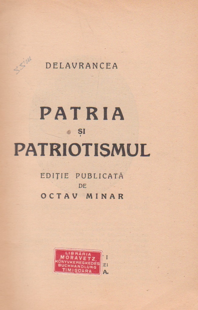 Comandă online cartea "Patria si Patriotismul - Editie publicata de Octav Minar" la 26,40 lei scrisă de Barbu Stefanescu Delavrancea, tiparită la editura Librariei Socec cu un număr de 105 pagini de anticariat (buna). Livrare din stoc cu plata ramburs sau online cu cardul.