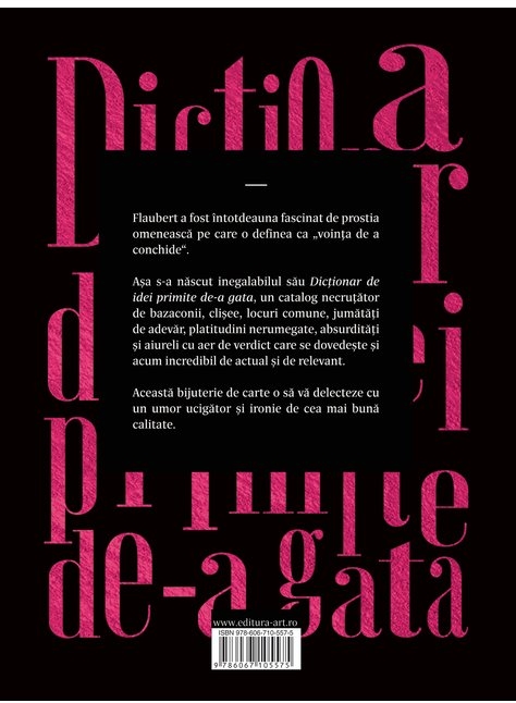 "O carte-obiect, care îmbracă în haine moderne și ingenioase un volum scris în secolul 19, Dicționarul de idei primite de-a gata al lui Gustave Flaubert se dovedește și astăzi – cu unele excepții ce țin de specificul epocii, dar și de limitările culturii noastre generale – o lectură la fel de actuală și de savuroasă. Străbătut de ambiguitate și de ironie, scris într-o falsă cheie gravă, care poate induce în eroare un cititor naiv sau neștiutor, volumul demontează convingeri incorecte și exprimări defectuoase, cu un ton plin de umor caustic." Citește continuarea recenziei pe blog.
