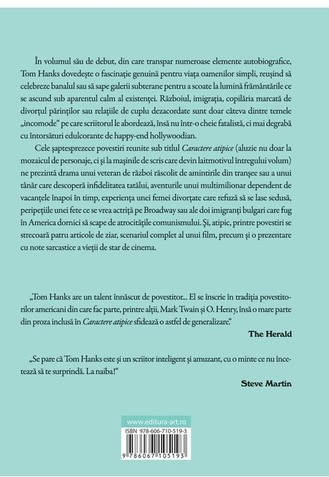 “Tom Hanks are un talent înnăscut de povestitor... El se înscrie în tradiția povestitorilor americani din care fac parte, printre alții, Mark Twain și O. Henry, însă o mare parte din proza inclusă în Caractere atipice sfidează o astfel de generalizare.” The Herald