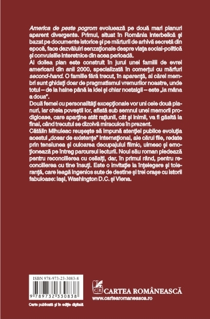 America de peste pogrom evolueaza pe doua mari planuri aparent divergente. Primul, situat in România interbelica si bazat pe documente istorice si pe marturii de arhiva secreta din epoca, face dezvaluiri senzationale despre viata social-politica si convulsiile interetnice din acea perioada.