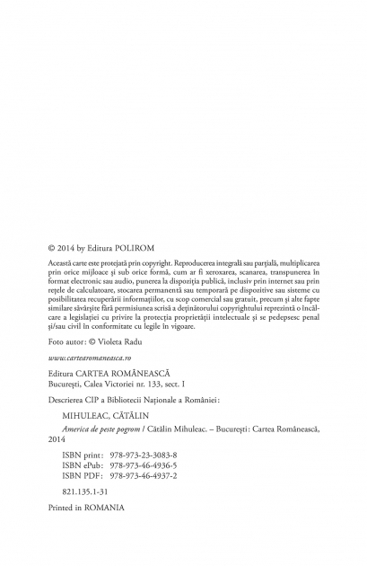 Comandă online cartea "America de peste pogrom" la 30,50 lei isbn 9789732330838 scrisă de Catalin Mihuleac, tiparită la editura Polirom face parte din colecția Cartea romaneasca. cu plata ramburs sau online cu cardul. Momentan titlul "America de peste pogrom" nu este disponibil însa vă puteți înscrie pentru a fi notificat în momenul reaprovizionarii.