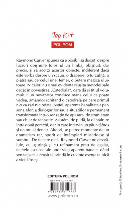 Raymond Carver spunea că e posibil să discuţi despre lucruri obişnuite folosind un limbaj obişnuit, dar precis, şi să acorzi acestor obiecte, indiferent dacă este vorba despre un scaun, o draperie, o furculiţă, o piatră sau cercelul unei femei, o putere magică uluitoare. Nicăieri nu e mai evidentă reuşita metodei sale decît în povestirea „Catedrala”, care dă şi titlul volumului: un nevăzător conduce mîna celui ce poate vedea, amîndoi schiţînd o catedrală pe care primul n-o va zări niciodată. Astfel, aparenta banalitate a personajelor, a dialogurilor sau a situaţiilor e permanent transformată într-o senzaţie de apăsare, de stranietate sau chiar de fantastic. Asistăm, de pildă, la o întîlnire între două perechi, dar în care intervin un păun ţîfnos şi un mulaj dentar. Alteori, se petrec momente de un dramatism rar, sporit de întîmplări misterioase şi sumbre. De fiecare dată, Raymond Carver ne dezvăluie, cu uşurinţă şi cu rafinament greu de egalat, fațetele ascunse ale unor vieţi aparent banale, dînd senzaţia că a reuşit să prindă în cuvinte esenţa tainică a vieţii înseşi.