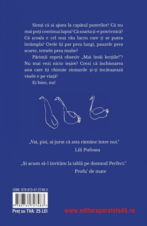Simți că ai ajuns la capătul puterilor? Că nu mai poți continua lupta? Că soarta ți-e potrivnică? Că școala e cel mai rău lucru care ți se putea întâmpla? Orele îți par prea lungi, pauzele prea scurte, temele prea multe? Părinții repetă obsesiv „Mai întâi lecțiile!“? Nu mai vezi nicio ieșire? Crezi că închisoarea asta care îți chinuie simțurile și-ți încătușează visele e pe viață? Ei bine, nu!